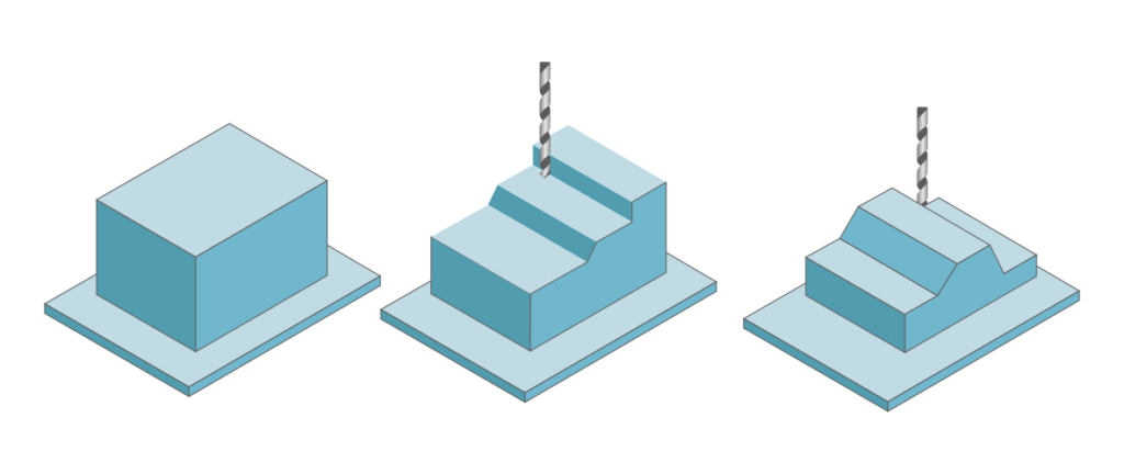 To make the CNC milling process as efficient as possible, the initial material to be removed is cut away by larger tools at a higher RPM rate. This enables the quick removal of the bulk of the material. When the part is nearly cut to shape, higher precision tools with fewer RPM come in to finish the part.