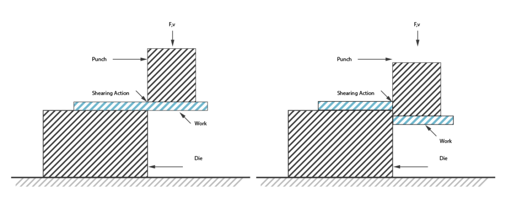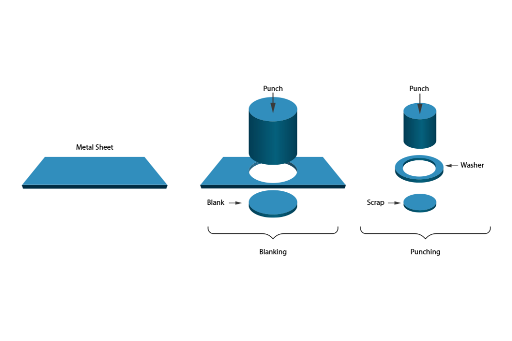 The punching process consists of fitting a sheet of metal in between a punch and a die, which are mounted inside a press. Both the punch and die have the same shape, though they vary incrementally in size so that when the punch is pressed into the die, a hole or depression is created in the sheet metal.