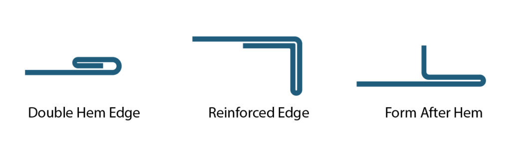 Like curls, hems are integrated into sheet metal parts to make the edges of parts safe for handling. There are a number of hem types, including open, flat and tear-dropped hems. Unlike curls, which have no raw edge, hems to still have exposed edges. For open hems, the inside diameter should be at least as large as the material thickness, while the length of the hem should be at least four times the metal’s thickness. For tear-drop hems, the same measurements apply as well as an opening at least a quarter of the thickness.